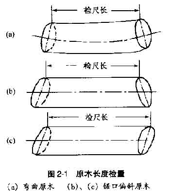 (1)長度檢量 ①檢量方法:長度檢量是在原木小頭斷面至大頭斷面之間相距最短處取直檢量。檢量時,量至厘米,不足厘米者四舍五入取整。 檢量彎曲原木、鋸口偏斜原木的長度時,均是量取兩頭斷面間的最小距離(圖2-l)。